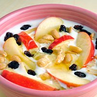 Apples, yogurt, honey, coconut shavings, raisins and nuts.