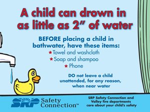 “The precious few seconds it takes to retrieve a towel or answer a phone could mean life or death for a child in a bathtub,” says Dewey Leitch, who oversees the SRP Safety Connection program. “Never leave a child unattended around water.”