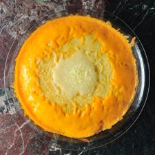 Divide batter into the two pans. Bake for about 15 minutes, until lightly browned. Take out of the oven and place mozzarella cheese in the midddle and cheddar chaeese around the edge – to make the “candy corn” effect. Place back into the oven until the cheese is melted. Cool slightly before slicing into triangles.
