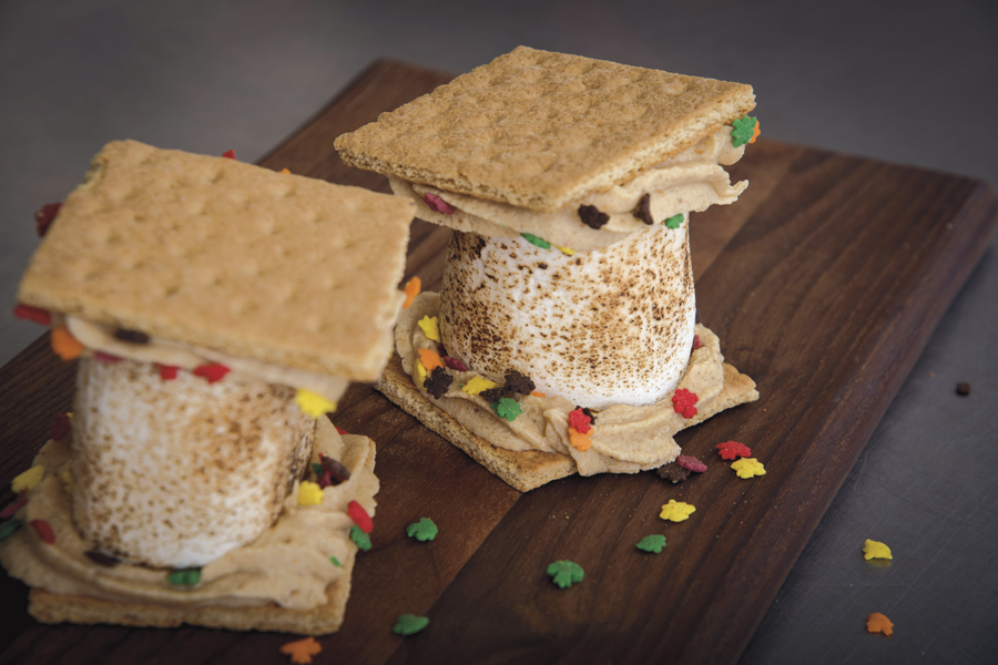 To assemble, smear desired amount of pumpkin white chocolate ganache on the inside of each graham cracker. Add a toasted marshmallow in between and sprinkle edges with festive toppings such as fall leaf sprinkles. Serves 8.