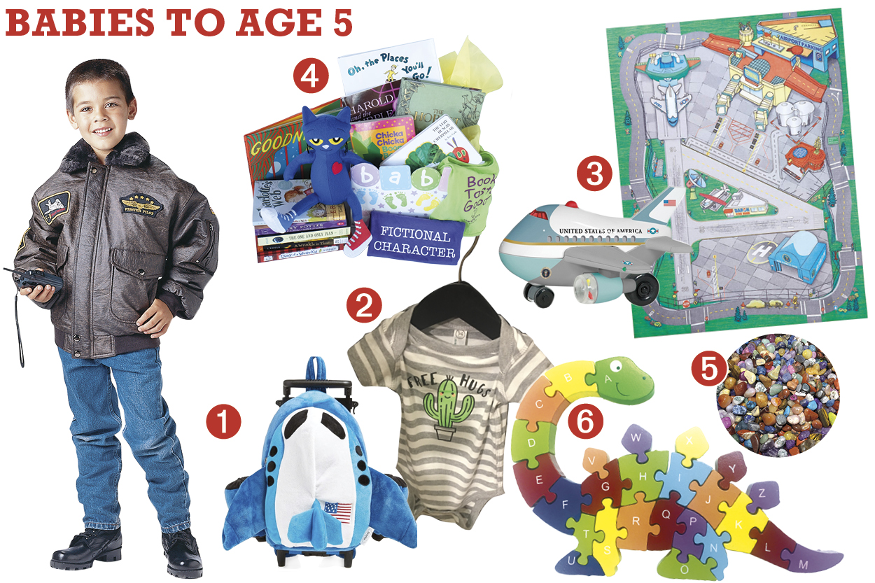 ➊ Airplane Rolling Backpack and Flight Jacket. Perfect for a tiny traveler, this soft airplane rolling backpack from Popatu can be filled with carry-on activities for an upcoming flight. Pair it with a tiny military-style flight jacket (in children’s sizes extra small and up). $32-$50 at the Arizona Commemorative Air Force Museum in Mesa.