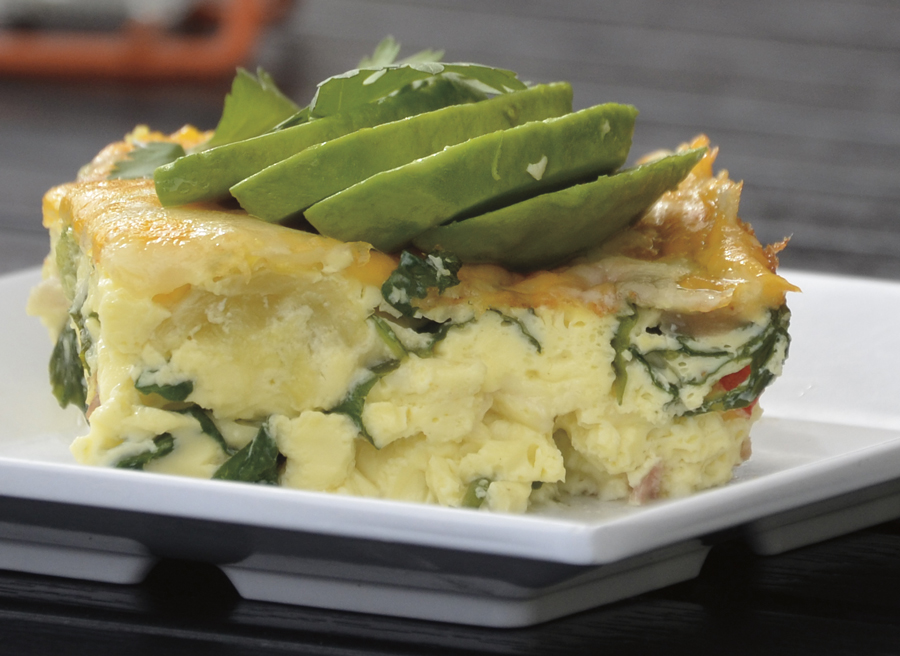 Bake in 375-degree oven for 15 minutes. Remove from oven and sprinkle remaining cheese on the frittata. Bake an additional 5 minutes, or until the cheese is melted and bubbly. Allow to stand for 5 minutes before cutting. Meanwhile, peel avocados and cut into quarters. Slice quarters into fans. Cut egg into equal squares and top with fanned avocado. Makes 8 servings.