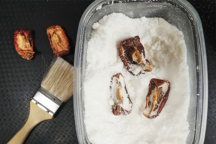 One of the main steps of mummification is removing water — a process called desiccation. Ancient Egyptians used a material called natron — a natural mixture of salt and soda — to desiccate the body during mummification. This is the same process you see happening to the apple slices. While some water likely evaporated from the untreated apple slice, the salt and soda mixture surrounding the other slices purposely draws out the water and helps prevent the growth of mold, bacteria and other microorganisms that would normally aid in decomposition. Use your weight charts to figure out exactly how much water was removed from each apple slice.