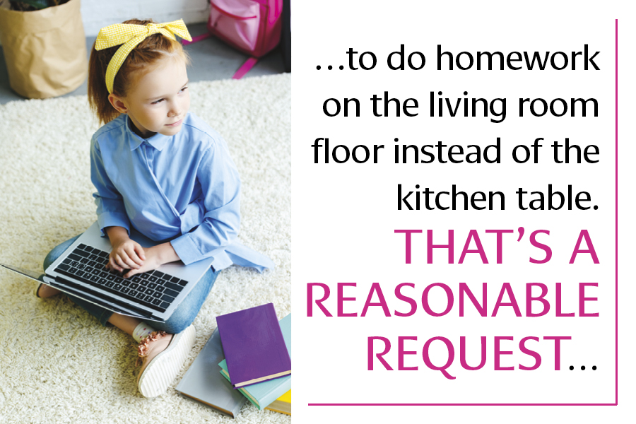 You say kids can take ownership of the homework routine by choosing when, how and where to work. Are there any restrictions on this? Every family is different. Setting the when, how and where should be a compromise between the parent and child. If the child isn’t choosing appropriate places, such as, “I want to do my homework while watching TV,” the parent will need to step in to explain why the television is not the best place to stay focused on work. But say the child wants to do homework on the living room floor instead of the kitchen table. That’s a reasonable request that should be given a shot.