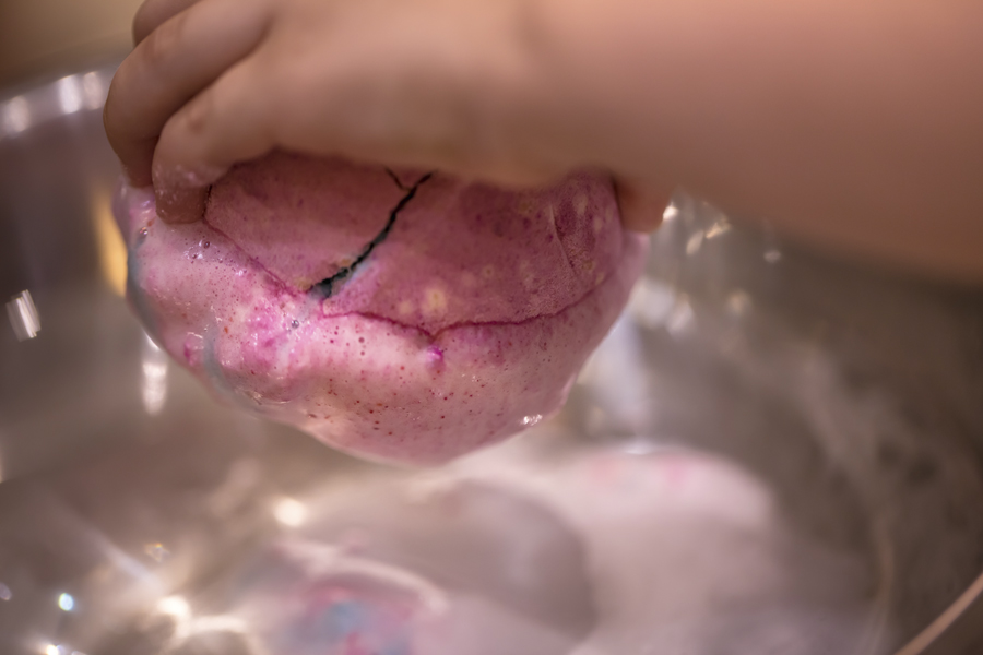 The reaction produces carbon dioxide bubbles, which are responsible for the highly-desired fizz in your bath bomb. Observe: Is there any change if you put the bath bomb in cold water vs. hot water? How does the size of your bath bomb affect its fizziness? How does the color of the bath bomb affect the water?