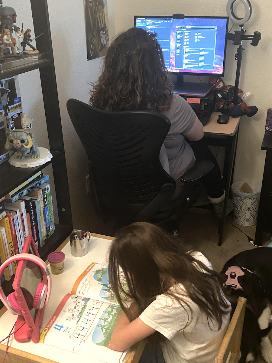 Erica Ward, a channel manager with Webgility of Scottsdale, has put activity desks for her daughters, ages 3 and 5, near own work space. “We’re all doing this at the same time and in this together,” she said. She and her husband balance their child-care responsibilities with one front-loading client meetings in the morning and the other ramping up in the afternoon.