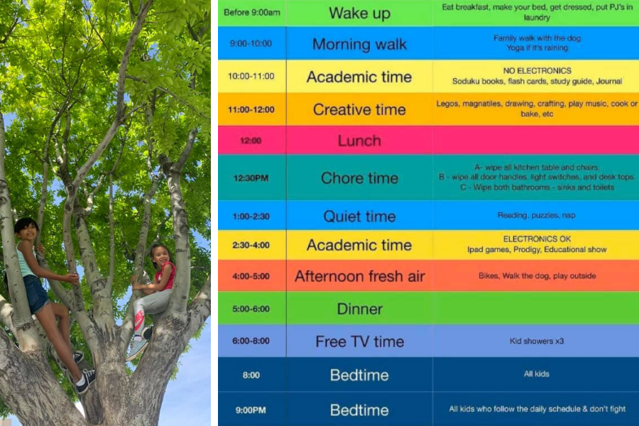 Junice Marino of Phoenix is the mother of four children. Here’s what’s working for her: “We have daily schedule and twice a day we have outside activities. I am a teacher. I highly recommend having daily schedules to follow — it helps kids and parents. She shared a photo of her two girls climbing a tree, and the schedule she is using: