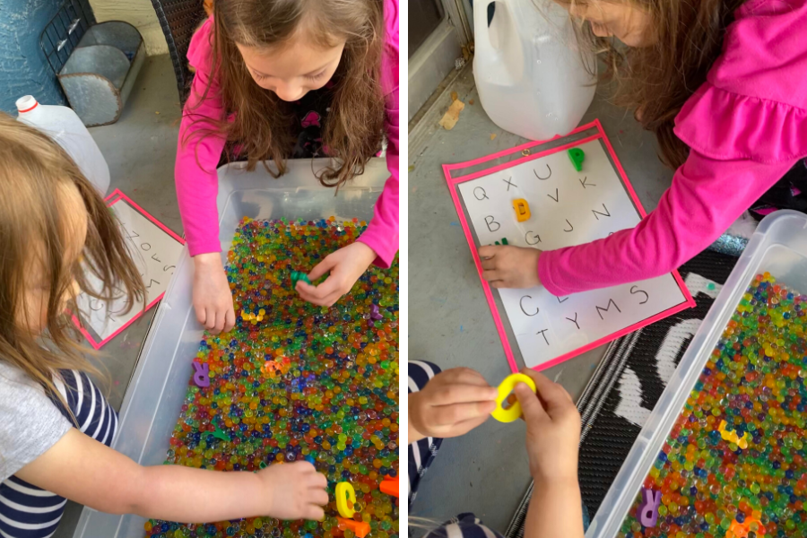 She put a package of water beads into an under-the-bed storage bin and tossed in some alphabet magnets. She printed the letters of the alphabet on some paper and the hunt was on!