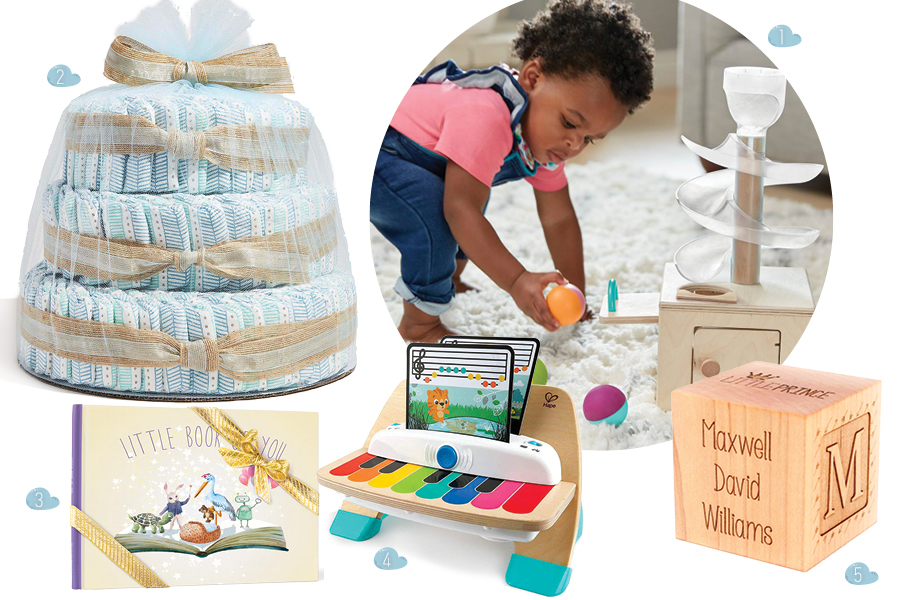5. Personalized Baby Block. A great, affordable baby gift, this engraved two-inch maple wood cube records baby’s birthday — time, location, weight, length, etc. — for a great keepsake. $19.50. 317-996-2124 or craftefamily.com