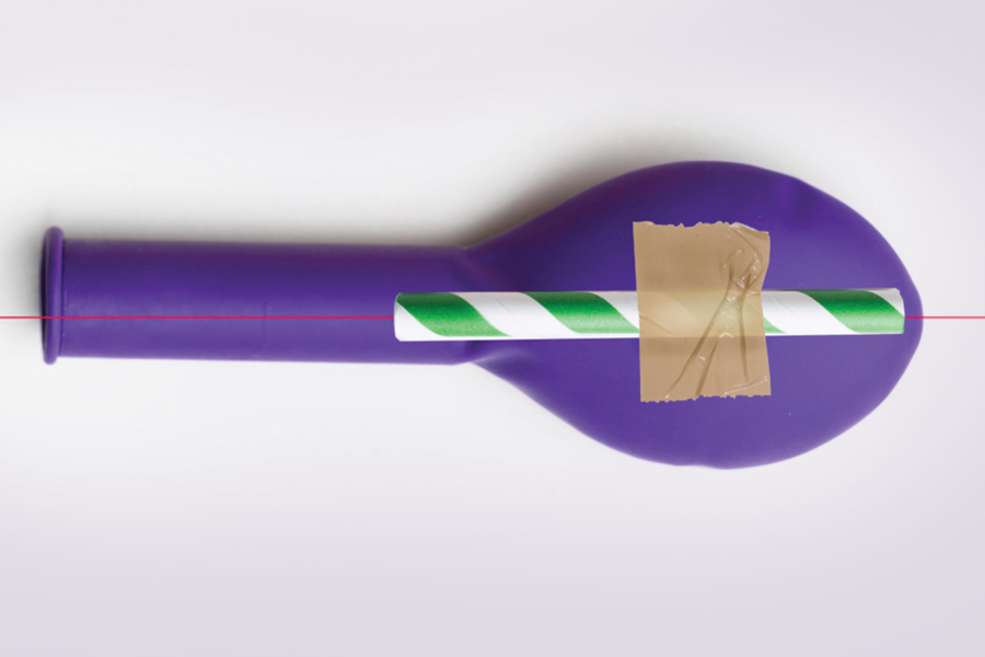 Here, the air in the balloon serves as the “fuel,” and as it escapes the balloon, your rocket is propelled in the opposite direction along the string. What happens if you use very little air? What happens if you add weight (like taped coins) to the balloon? Can you adjust your balloon rocket to travel twice the distance of your original string? Make new observations, and try your own experiments. Have your space explorer explain how this rocket is similar to the ones that go to space.