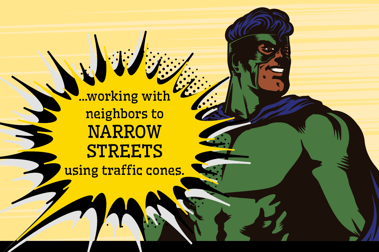 There’s another angle, too. “Try out some tactical urbanism,” he suggested — for instance, working with neighbors to narrow streets using traffic cones. “We want to live in places where our kids can walk to school, to a friend’s house, to the store,” he noted.
