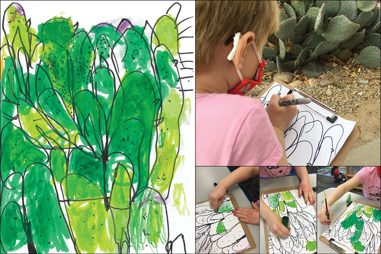I asked them questions about the desert, where the javelinas live. What kind of environment do we live in, here in Arizona? Who else lives in the desert? They mentioned scorpions, snakes — the conversation kept going. The children wanted to know more about types of cacti. Do they bloom? We talked about a saguaro cactus near the school. They wanted to investigate, so I said, “Let’s just go and search!”