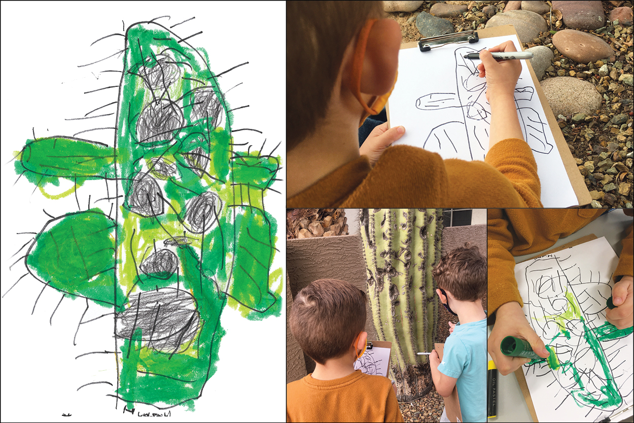 We took our clipboards, paper, and Sharpies. They noticed many, many kinds of cacti right in the neighborhood. The saguaro was the show stopper. We gave them some time to settle down, find the cactus they wanted to draw, and figure out how to approach it. To search, ask questions. We were in no rush to finish.