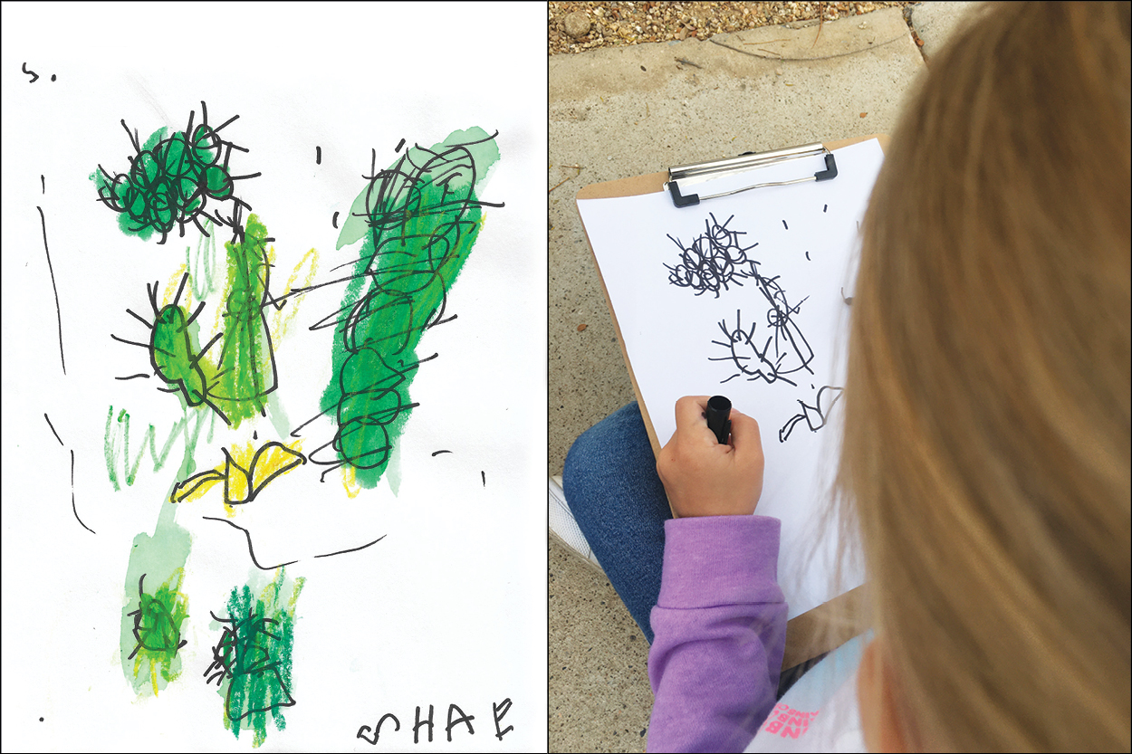 Sometimes children do that: draw and talk at the same time, narrating what they are seeing and observing. Anniston noted that the needles were different from those of other cactus types. She mentioned that it would take time to finish her work.