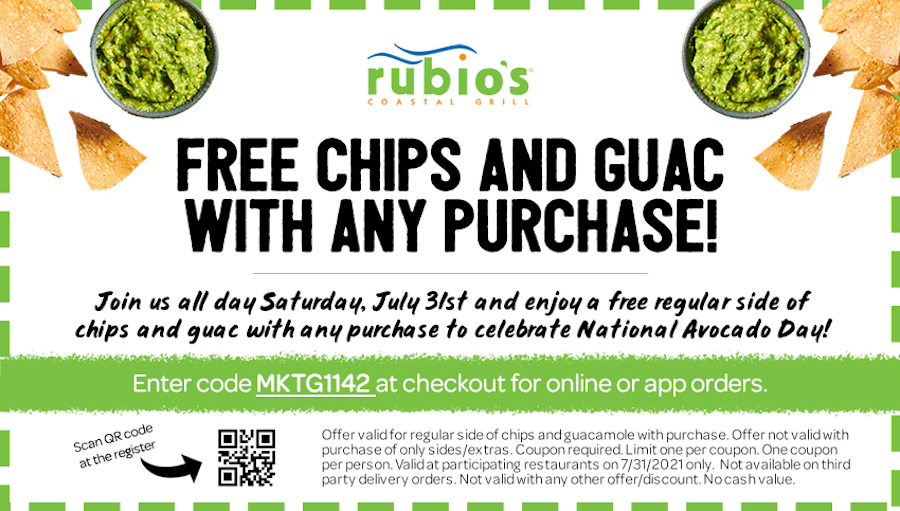 On Saturday, July 31, Rubio’s is celebrating National Avocado Day by giving out free, freshly made chips and guacamole with any order. Rubio’s guacamole is made onsite daily, using rich Hass avocados, cilantro, garlic, lime juice and natural sea salt. Tortilla chips are also prepared fresh daily with a light sprinkling of all-natural sea salt.