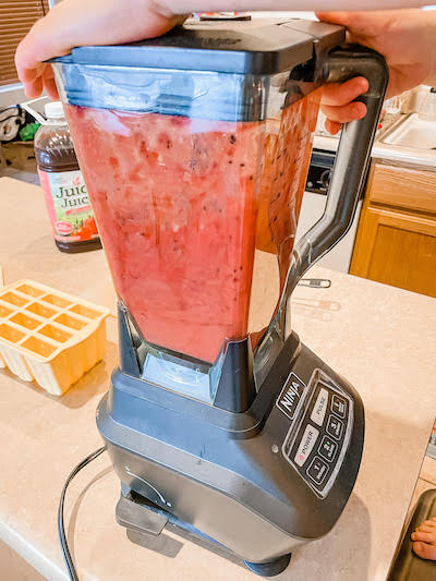 4. Stir in ¼ cup ice-cold juice (we just had ours in the fridge) and pour cooled gelatin mixture into a blender. We did this while we finished chopping the fruit so that it could cool a bit more.