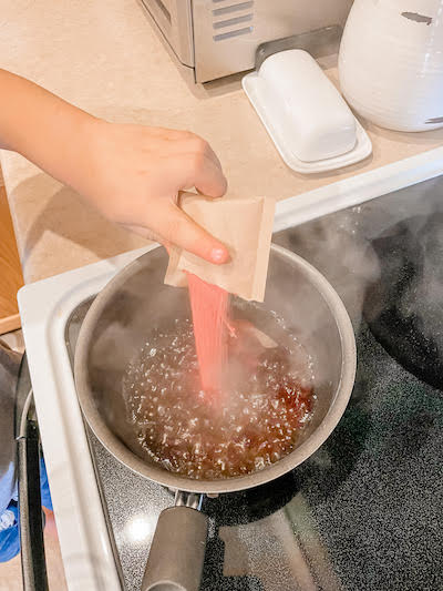 3. Bring 1 cup of juice to a boil, and then dissolve gelatin mix in boiling juice. Make sure to watch closely—the juice boils rapidly! We learned that the packet of Jello turns into a sticky mess from the steam so dump it in quickly.