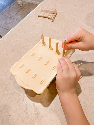 6. Pour remaining diced kiwi into each of 8 ice-pop molds; insert sticks. Click here to see where we got our popsicle mold! We love this one because it uses disposable sticks, which means fewer parts for the kids to lose.