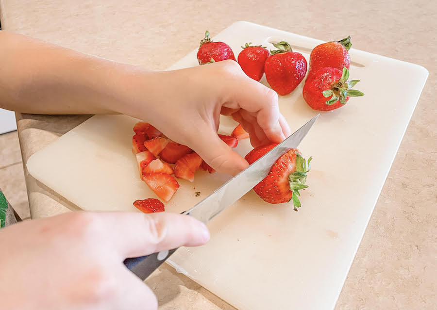 1. Chop strawberries into halves. My 8-year-old opted to chop them smaller. I don’t argue with the chef.
