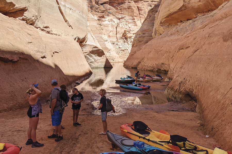 By water. If you have access to Lake Powell, consider getting to Antelope Canyon by water. A narrow canyon south of the Antelope Point Launch Ramp (not far from Antelope Point Marina) leads directly to the trailhead. There are no permits required to access the trailhead, and hikers do not need a guide — but as people who value these special places, we encourage common sense and respect for the area. We were able to drive our speedboat back to the trailhead and anchor it, using our jet skis to ferry our crew from the water to land. To our surprise, we saw someone in there with a houseboat, which we wouldn’t recommend. But, if you don’t have access to a speedboat, there is a tour company that rents kayaks from the Antelope Point Launch Ramp. If kayaking, whether you own or rent, plan to go early to avoid afternoon wind and choppy water, and expect to need about five hours to complete the entire trip.
