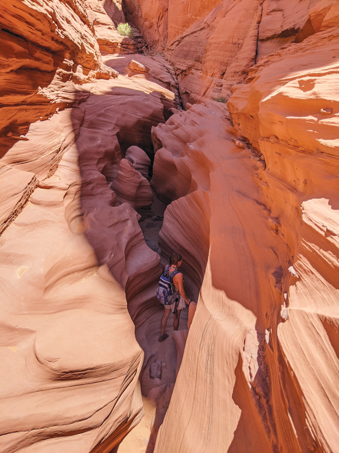 The hike through the canyon is an out-and-back style hike, which means whatever you missed coming in, you can catch on the way out. We packed snacks and carried water bladders because we were unsure about how exposed the trail was, but we found out it offered shade about half the time. The best part about the hike, besides the otherworldly landscape, is that you decide how far to go. We hiked until the swirling sandstone came to an end and then chose to explore a side canyon for a while. But your ending point is entirely up to you, so long as you don’t trespass on protected land.