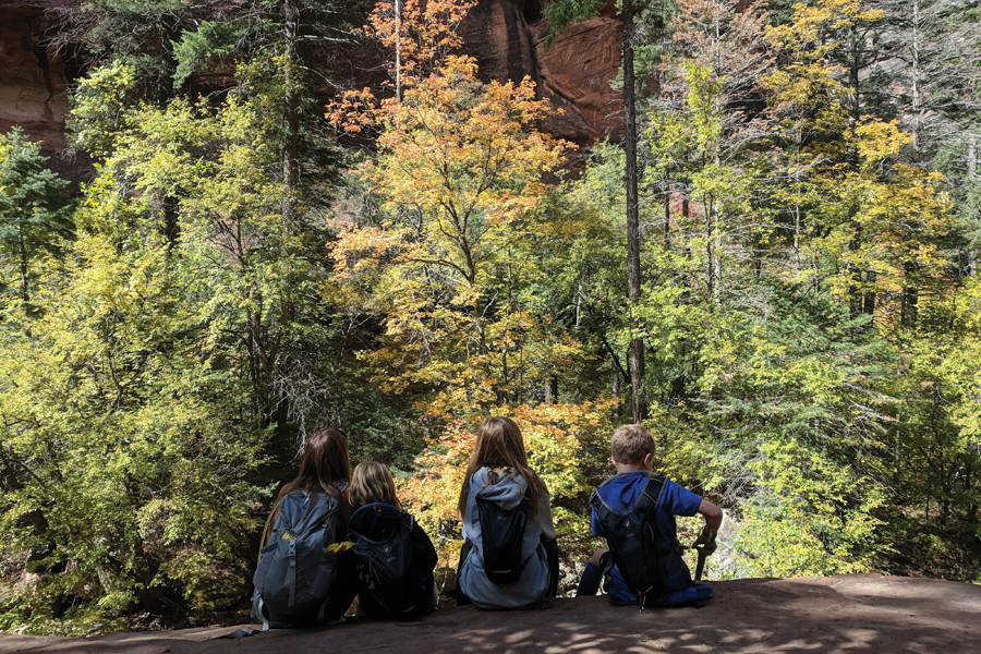 The easy-to-hike trail crosses water a number of times, and guides you back into a wooded area filled with rainbows of leaves against towering canyon walls. Be prepared to manage wet feet (and maybe more if your crew is super curious), navigate a heavily trafficked trail, and temperature changes. Depending on the weather, the shade can be chilly deep on the trail while spots in the sun warm up quickly.