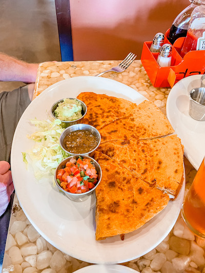 As I’m sure you know by now, my husband is all about the Mexican dishes, so surprise, surprise…he ordered a quesadilla with a chipotle tortilla, pulled chicken, and smoked mozzarella. It came with a side of crispy polenta tots which we had never had before! I’ve seen polenta in the grocery store and now I’m feeling a little more inspired. I ordered on the lighter side after the chops and pretzel and ordered the citrus avocado salad with this amazing cilantro lime dressing! The food came out quickly and it was all so delicious—we had no leftovers to take home!
