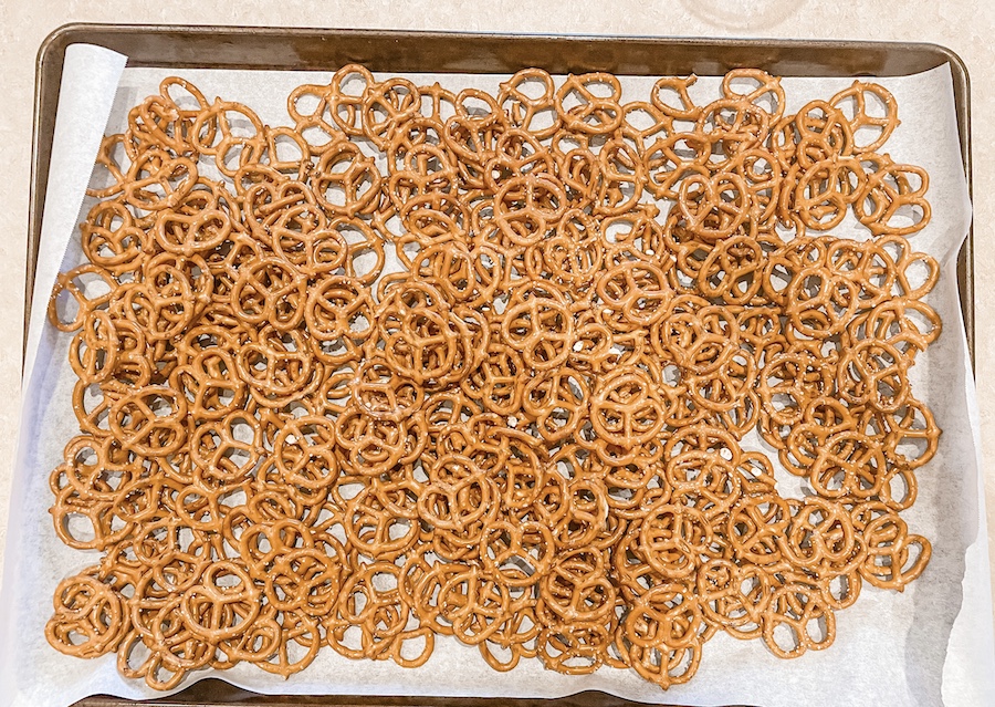 Preheat oven to 200° degrees F. You can either grease a large sheet pan with cooking spray, or line it with parchment paper. Spread the pretzels on your pan and set aside.