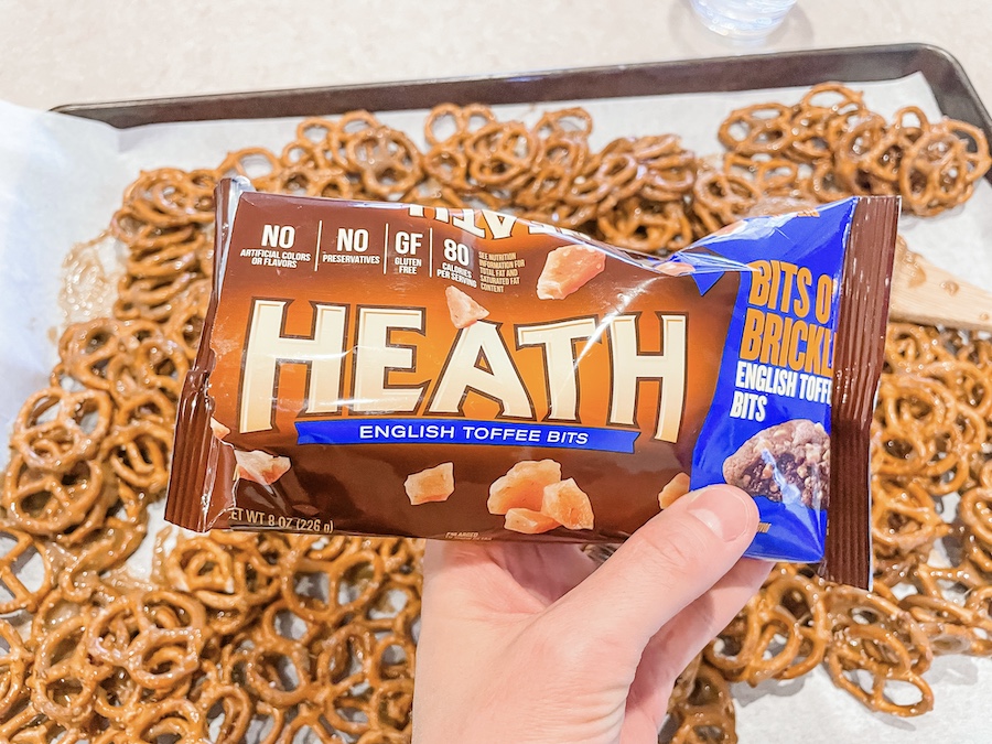 Pour the hot toffee mixture evenly over the pretzels; sprinkle half of the bag of toffee bits over the pretzel mixture, too. Toss the pretzels to coat evenly in the toffee mixture and toffee bits.