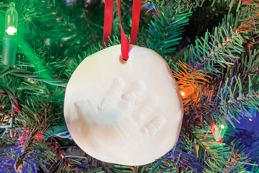 - Press your child’s hand to make an imprint and use a straw (or similar) to put a hole at the top for ribbon.