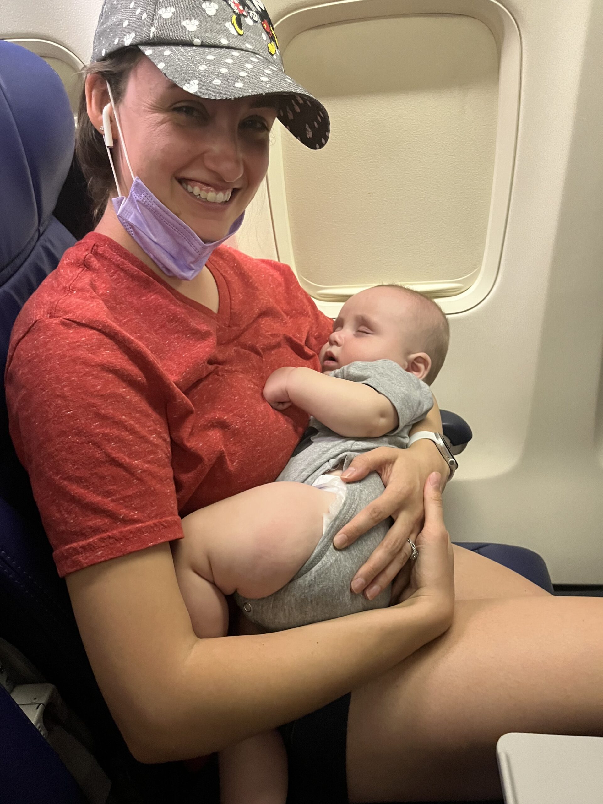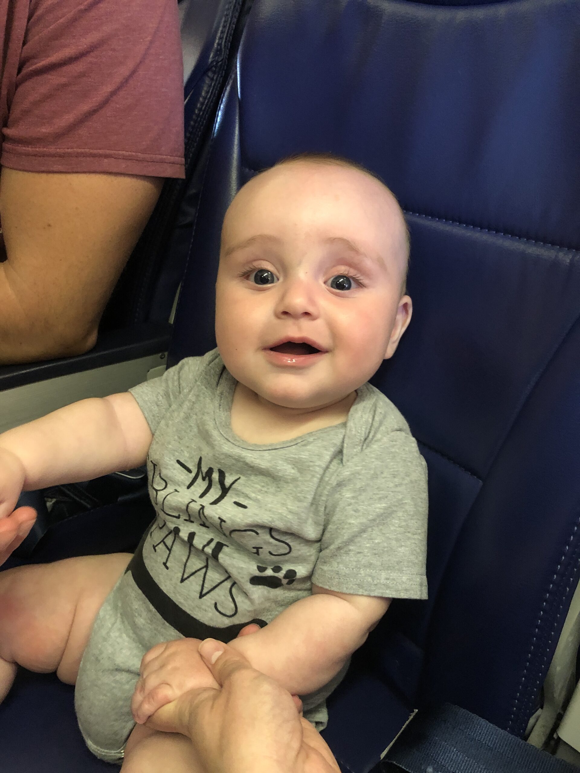 - Put the baby on the seat in between the two of you if you’re traveling with someone, even if the baby is a lap child. We just kind of held the baby on the seat. Once people see the baby, it’s likely no one will want to sit with you or ask you to move the baby. We ended up getting a row to ourselves this way on both flights even when they said it was going to be completely full.