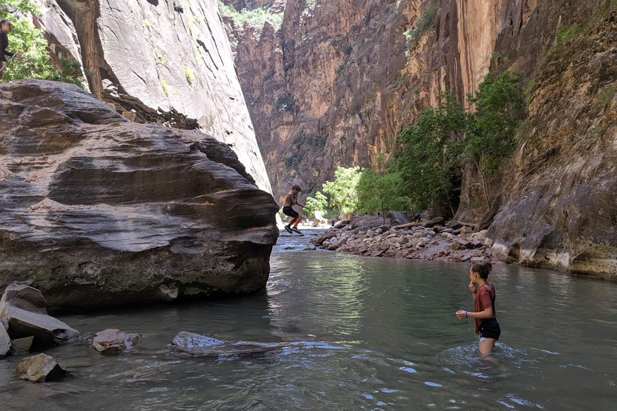 They moved from jumps at the lake to jumps in The Narrows at Zion National Park to jumps from a waterfall at Fossil Creek, to this — a true bouldering climb leading to a rewarding descent. And where they used to rely on us entirely to check for hazards and depth, they now work together to assess safety and decide where exactly to climb and jump.