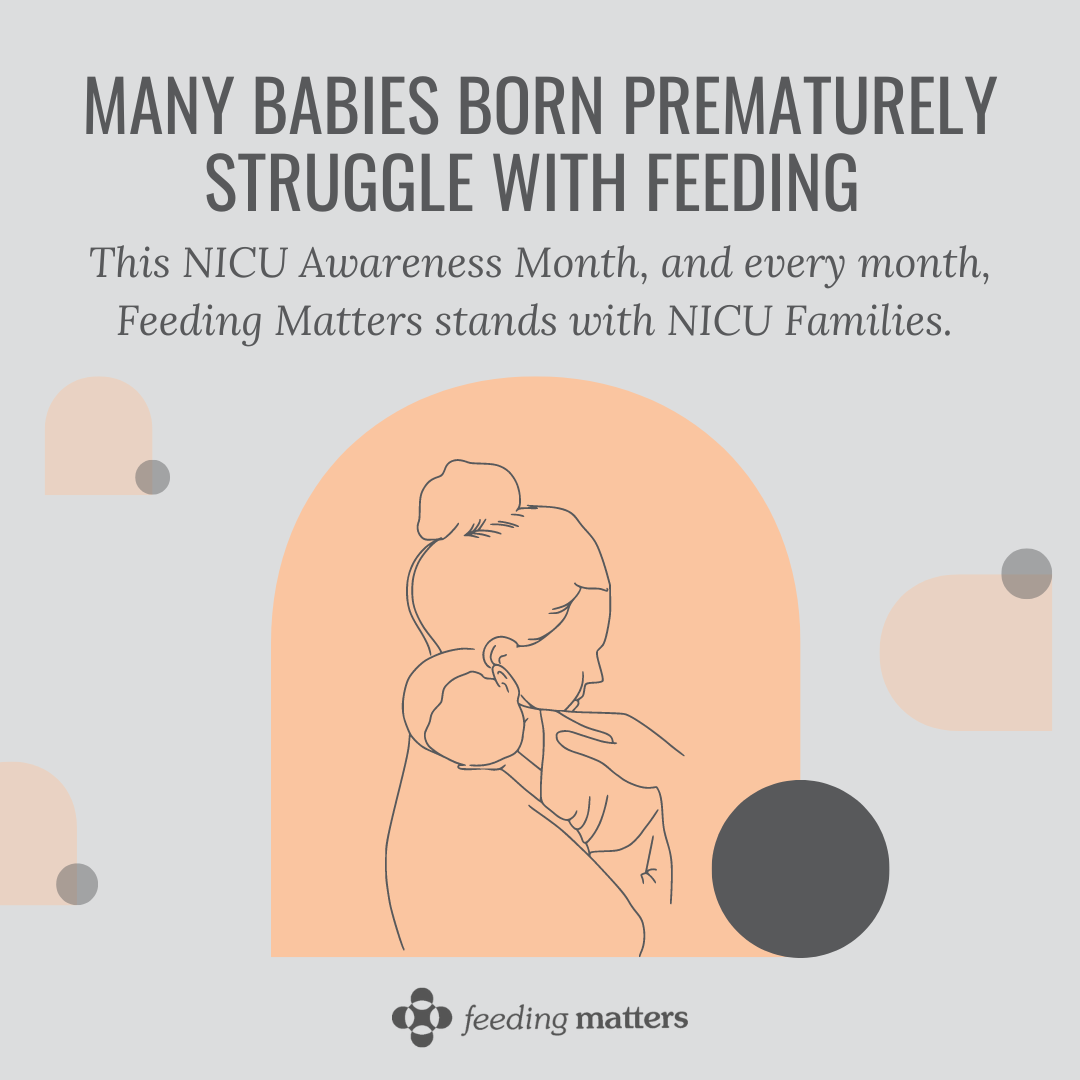 Another cause that is close to my heart which has influence on and relationship with the many feeding challenges a NICU family might face is Pediatric Feeding Awareness which is celebrated in May. More than 1 in 37 children under the age of 5 in the US annually experience Pediatric Feeding Disorder, which is more than the number of children with cerebral palsy or with autism. PFD is not rare. Many of those represented in the PFD population were born prematurely and/or spent time in NICU.