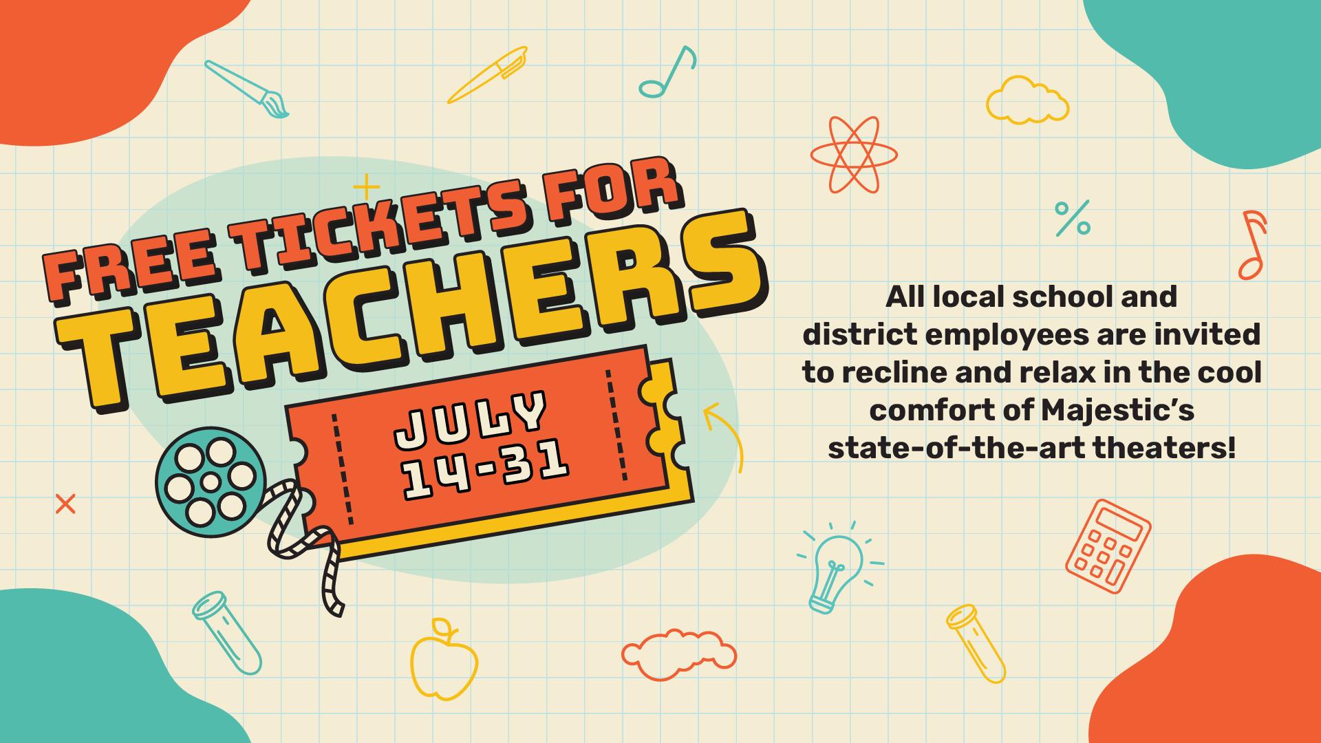From July 14 to July 31, all local school and district employees are invited to recline and relax in the cool comfort of Majestic’s state-of-the-art theaters. Movie admission is compliments of Majestic.