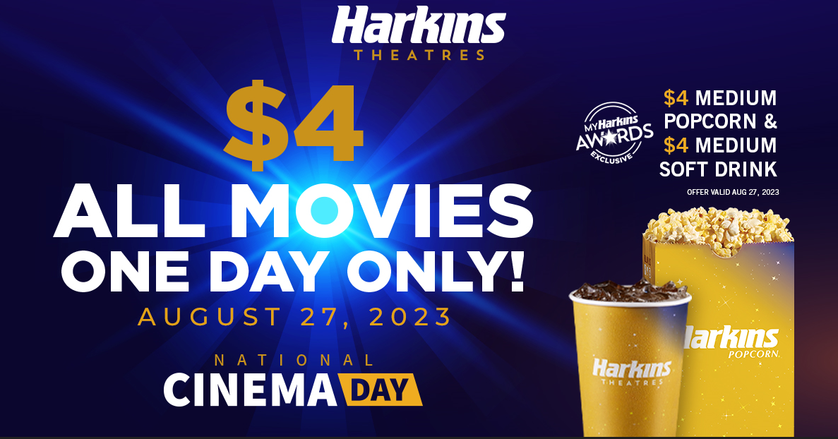 Harkins Theatres is celebrating National Cinema Day on Sunday, August 27 with $4 for any movie all day long. National Cinema Day brings together moviegoers of all ages to experience films on the big screen the way they were meant to be seen for a discounted price.