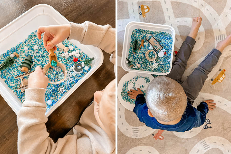 I opened the kit, and my toddler went to town! He must have played with the kit for an hour. Pouring rice from the bin to a cup, burying the sled, making the little person sled down a pretend hill, and just feeling the rice in-between his fingers. (And making it rain a little bit of rice on his head…I didn’t say it was the cleanest gift!).