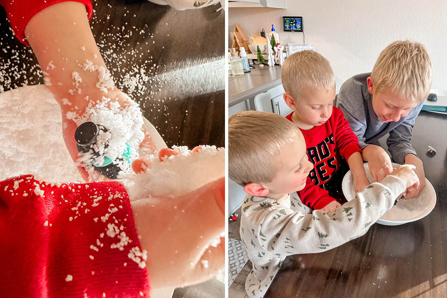 I saved what I thought would be the MOST fun for last and we made the Instant Snow Busy Hands Kit! Turns out—it was also the messiest! But our toddler and preschooler loved squishing their hands in the bowl. You just add water, and right before your eyes it transforms into fluffy, squishy snow. While we felt comfortable with our toddler playing with it just keep in mind that it is NOT safe to put in mouths.