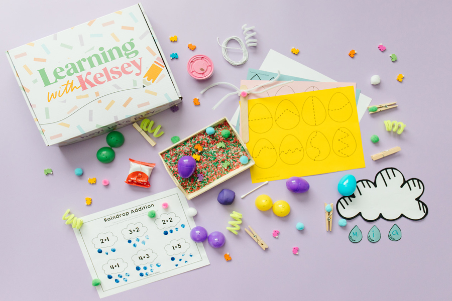 This eventually led Kelsey to start Learning with Kelsey, where she sells activity boxes, sensory bins, and downloadable worksheets to promote learning and creativity for kids ages two to five.