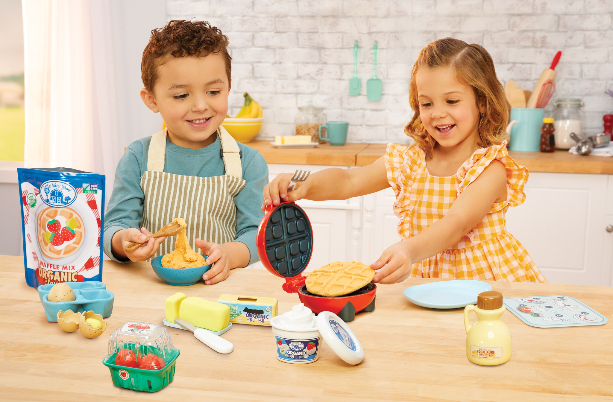The waffle mix, whipped cream, butter and eggs yolks are all made of reusable Make-It! Mix play sand that easily shapes into detailed waffle designs, allowing for tactile and creative play. My son loves cracking open the eggs and pressing the waffle “dough” in the waffle iron.