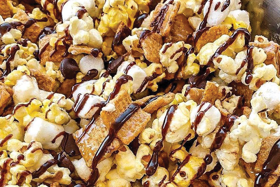 - In a bowl add the popcorn and golden graham cereal. Then, in a saucepan over medium heat, add the butter, karo, and sugar. Stir really well and bring to a rolling boil for a few minutes.