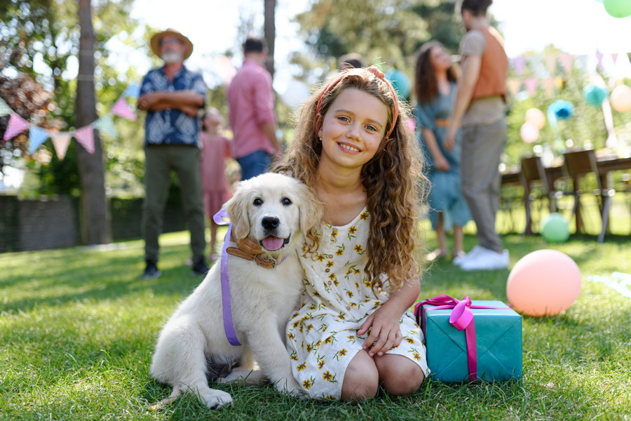 Carl the rottweiler and the toddler in his care watch the preparation for Carl’s surprise birthday party.