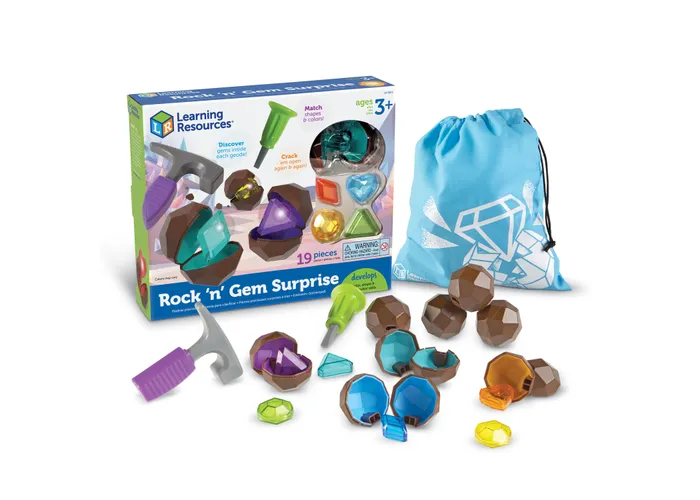 Rock ‘n’ Gem Surprise. ($27) Crack open a colorful gem surprise! Little ones get a no-mess introduction to sorting, matching, and counting with the play geodes and gems of Rock ‘n’ Gem Surprise. Using the included play hammer and chisel, kids can crack open each reusable play geode and discover the translucent plastic gemstones inside.
