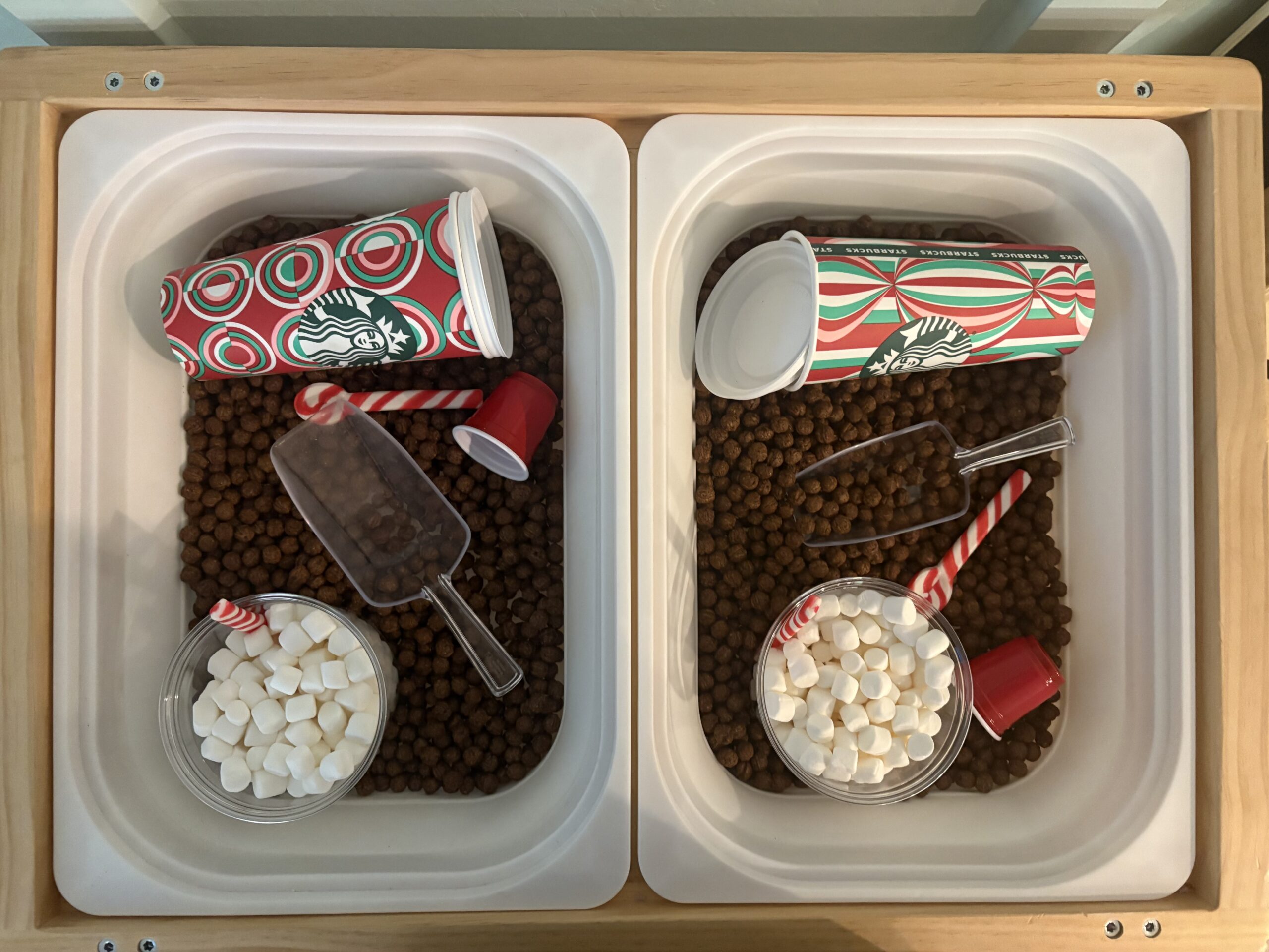 Sensory play is always a hit in our house, but holiday-themed sensory bins take it to another level. One of our favorites is a simple hot cocoa sensory bin. Here’s how I put it together: