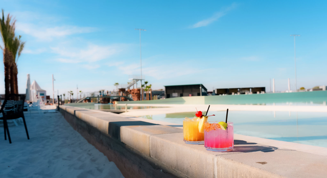 Tucked just steps from the water’s edge, this coastal-inspired spot brings a surfside dining experience right to the desert. The atmosphere is relaxed, breezy, and effortlessly fun, with that “toes-in-the-sand” energy. There’s even sand just steps away from your dining experience!