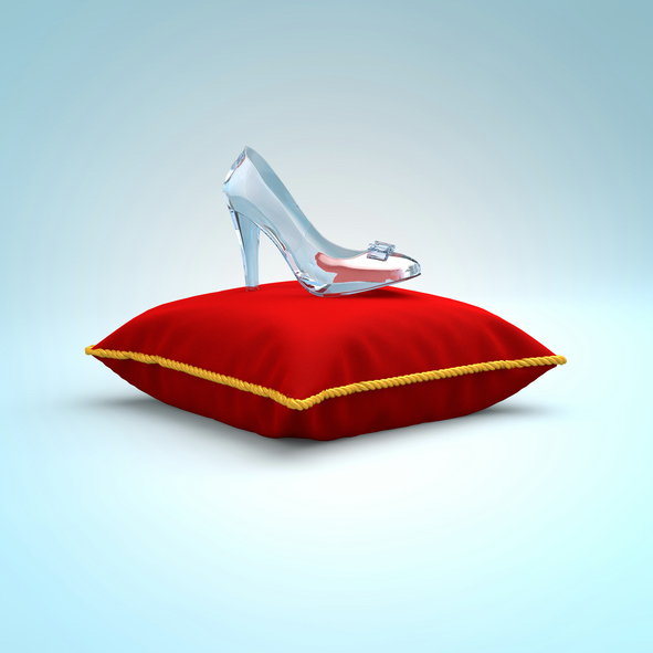Cinderella glass slipper on the red pillow side view