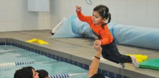 Into the pool, fully clothed